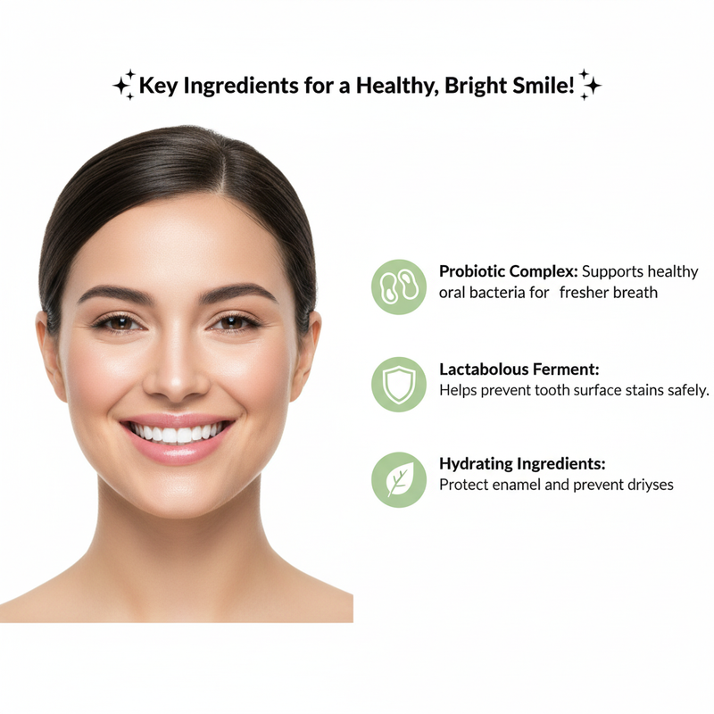 Powered by probiotic technology and natural brightening ingredients, this toothpaste gently removes surface stains, fights plaque, and keeps your mouth fresh all day.